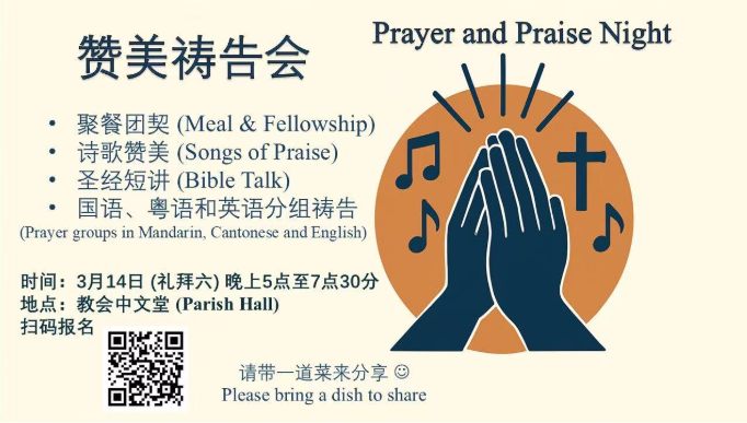 3. 为周六赞美祷告会:感谢神赐下祷告的权利和教会重视祷告。祈求下周六14/3祷告会,众多弟兄姐妹参加,一起享受聚餐,团契,同心赞美,在祷告中倚靠神。